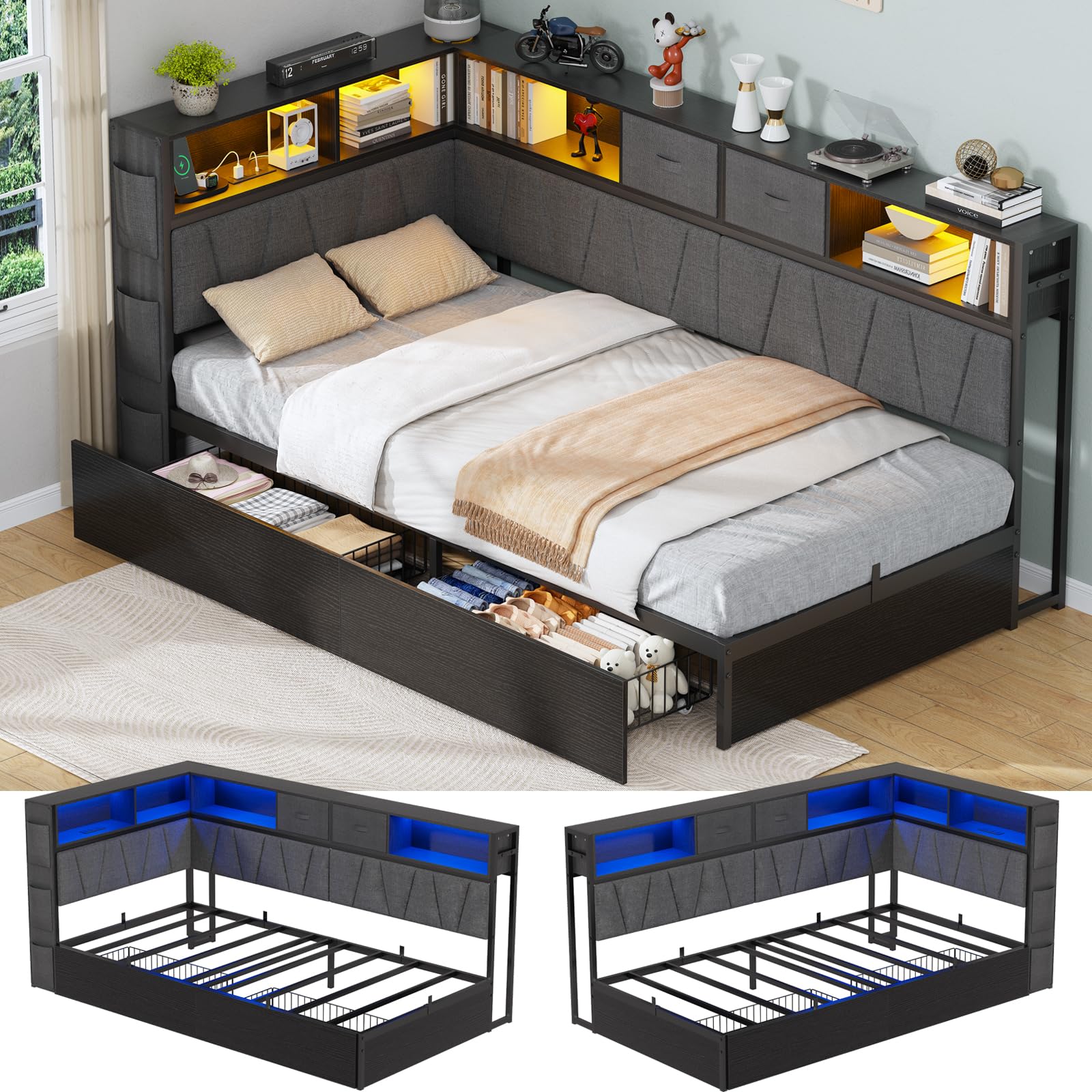 - This corner twin xl bed features an L-shaped design with storage guardrails, ensuring safety and a cozy corner for kids’ rooms. Its flexible installation suits various spaces—bedrooms, living rooms, or guests rooms. offering a place to lounge, sleep, and even store, so your teen can relish in a treasured spot that's all their own.