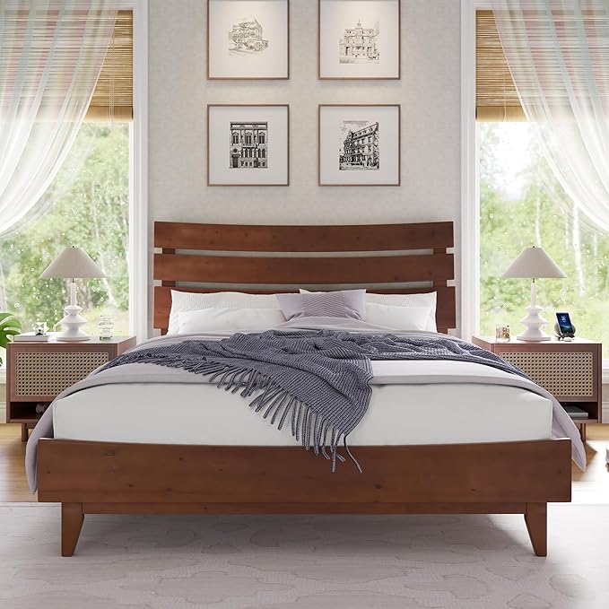 King Size Solid Wood Bed Frame, Mid-Century Platform Bed with Slatted Headboard