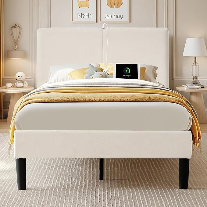 - [Type-C & USB Charging Ports]: This beige full bed frame built-in Type-C and USB ports (compatible with Android and iPhone) to keep your mobile phone, tablets, lamp, humidifier and other electronic devices always online but no outlet is needed.