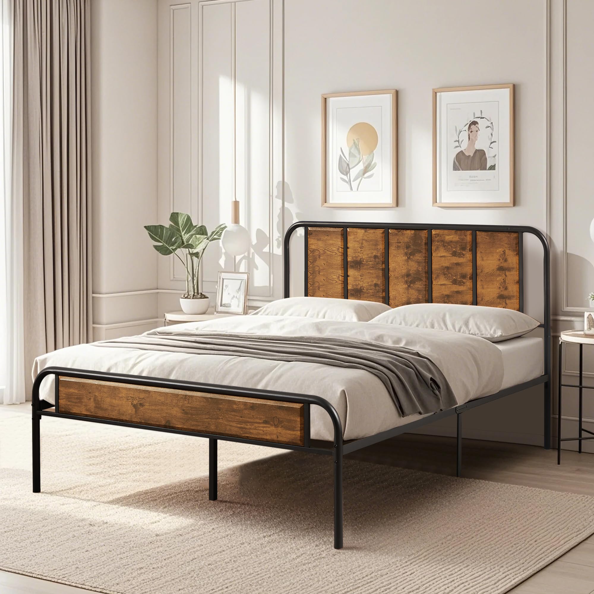 - Featuring a wooden grain headboard and footboard in a rustic industrial style, this queen bed frame adds a touch of elegance to any room. The three-dimensional patchwork design enhances the aesthetic, making it ideal for bedrooms, dormitories, guest rooms, and more.