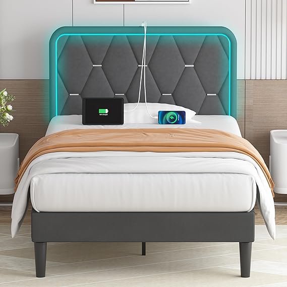 - Stay Powered Up: This twin bed frame with headboard features Type-C & USB charging Station within reach, allow to charge tablets, phones, or other electronics. With a headboard height adjustment from 39.8”-47.6”, the upholstered platform with headboard is good for 4-14 inch mattress. Our single bed frame also offers a comfortable backrest for reading or watching TV.