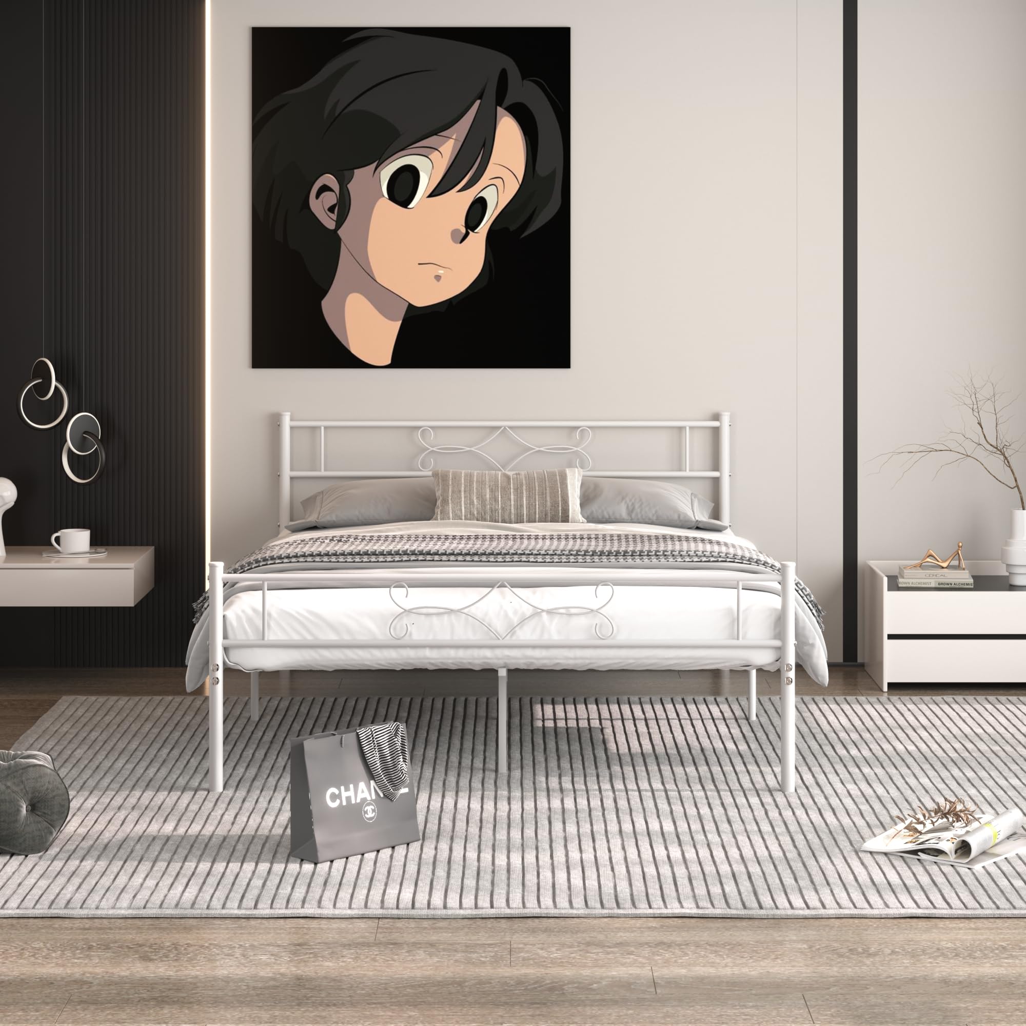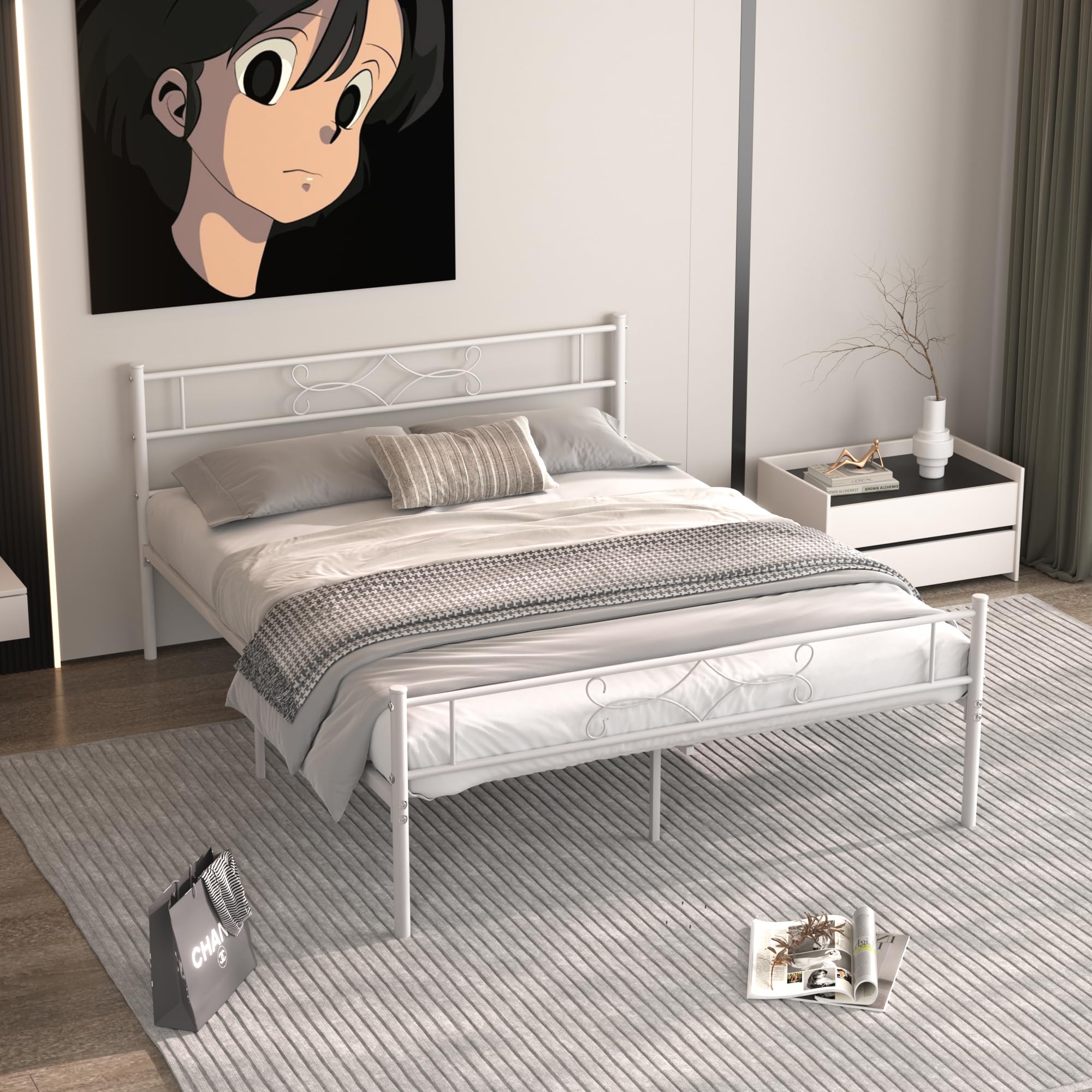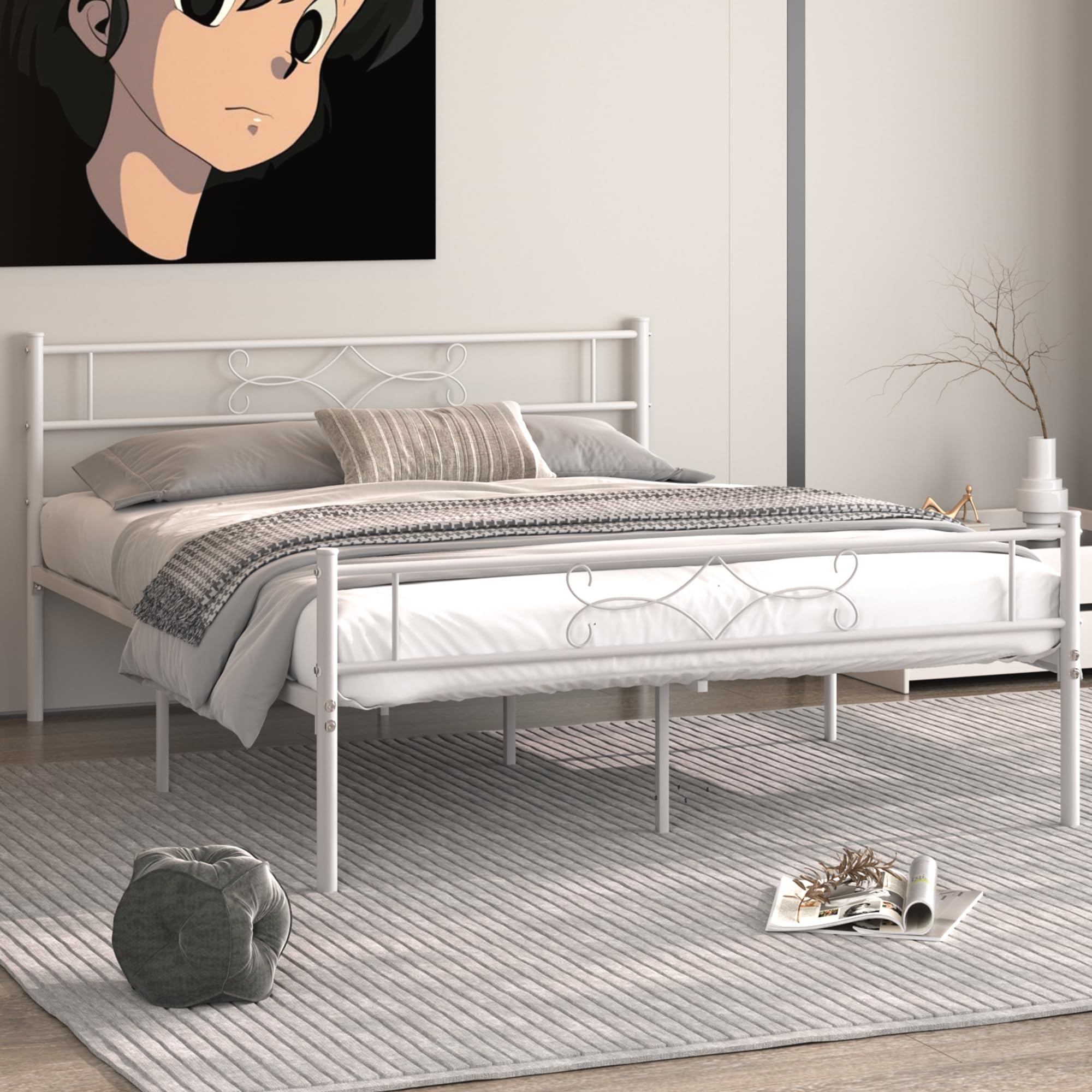White Queen Bed Frame with Headboard/Metal Platform Base/Mattress