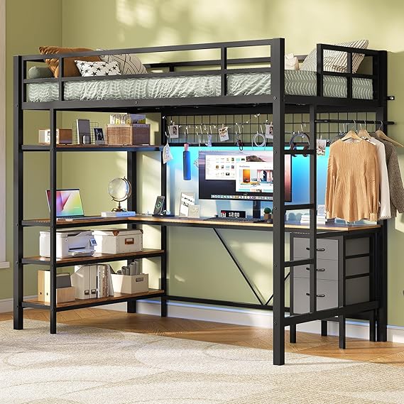 - The loft bed twin size can be configured as two separate spaces. While satisfying rest, the 59.2’’ space under the top bunk bed create a productive, simple work, study or gaming area for your child, ideal for adults and teens. A 76.6-inch-long L-shaped desk can hold your computer, monitor, keyboard, files, books. Plus the 2 AC Outlets & 1 USB and 1 Type C charging station, make it easy to power up your computer, phone, or gaming devices.
