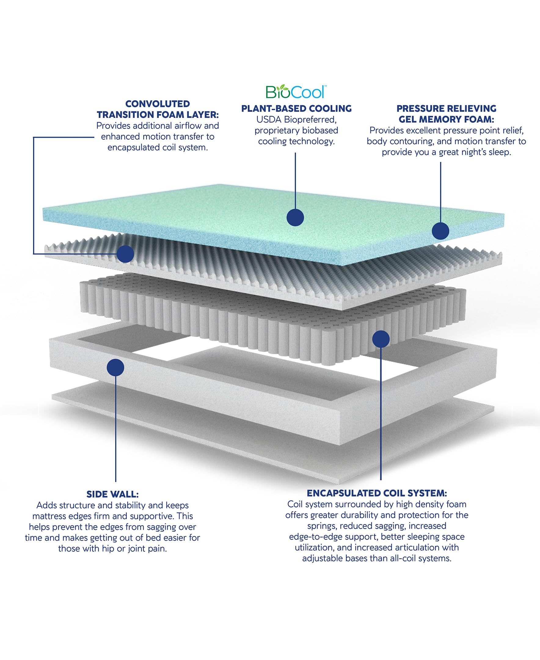 - Sleep Cool: Our 12-inch Hybrid Gel Memory Foam Mattress in a Box features a cold-touch fabric cover, BioCool technology, and a 3-layer memory foam and encapsulated coil system; Designed for a platform bed, this mattress is adjustable bed friendly, too