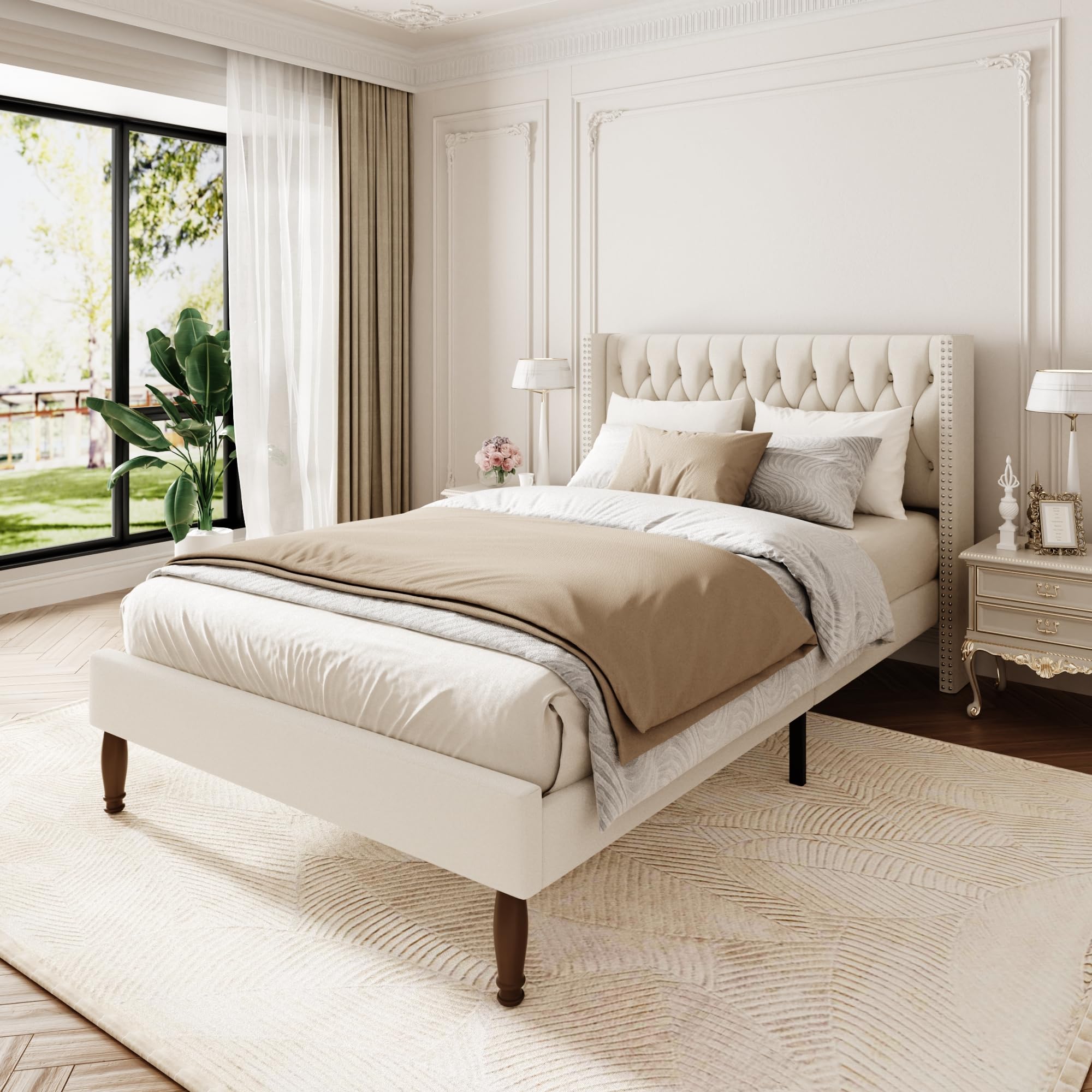 - Equipped with magic tape and EVA mute strips, this upholstered bed frame minimizes the friction between wooden slats and the metal frame, guaranteeing a silent and restful slumber