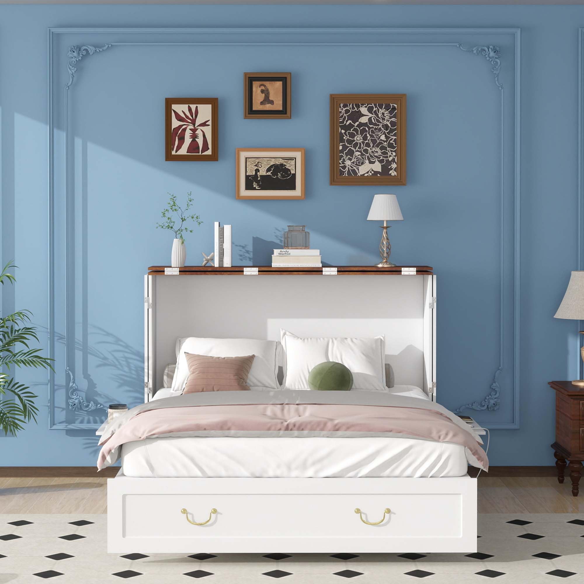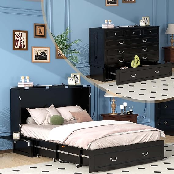 Queen Murphy Bed with Charging Station for Guest Room, Hideaway Cabinet