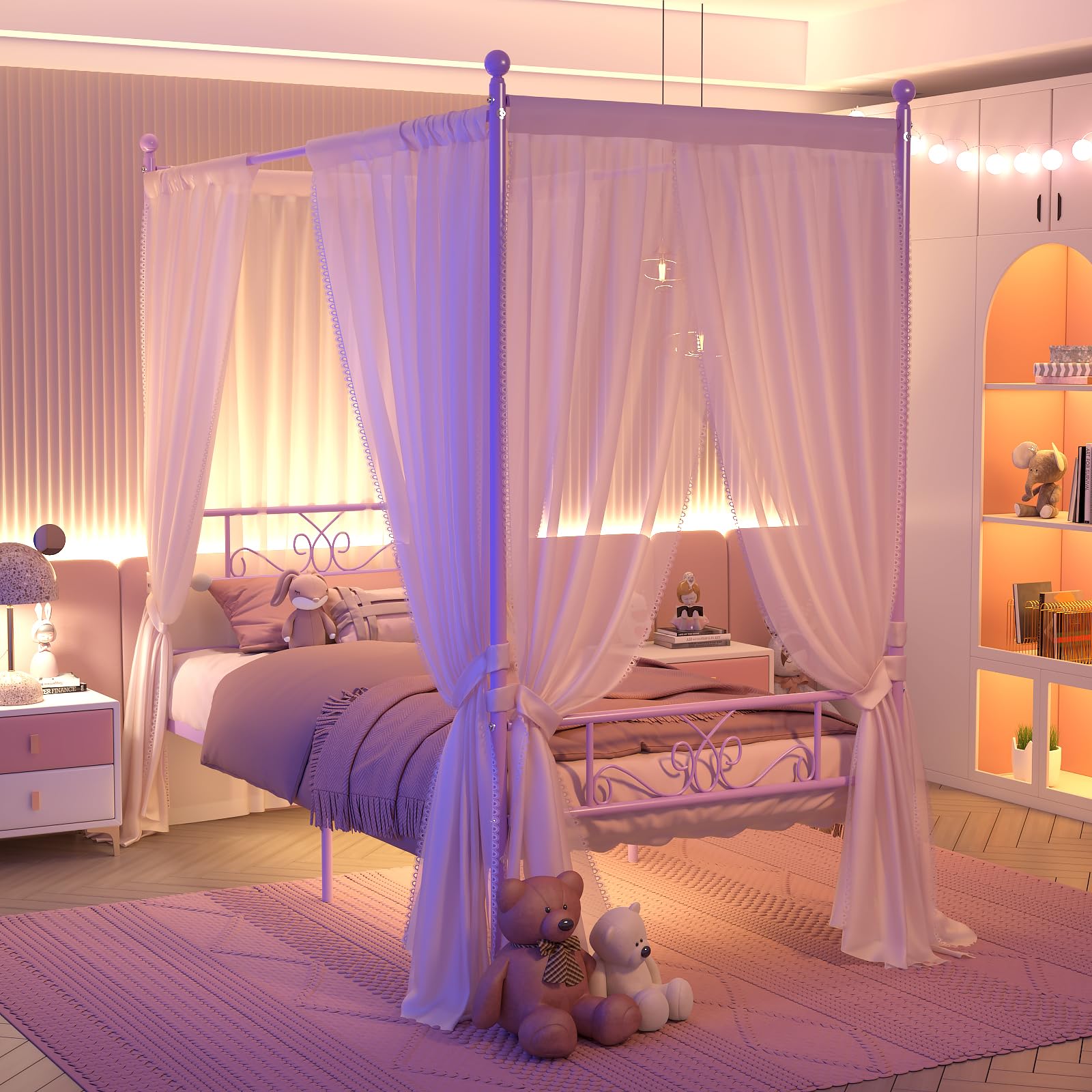 Twin Canopy Bed Frame with Headboard and Footboard, 4 Posters Metal Bed Frame