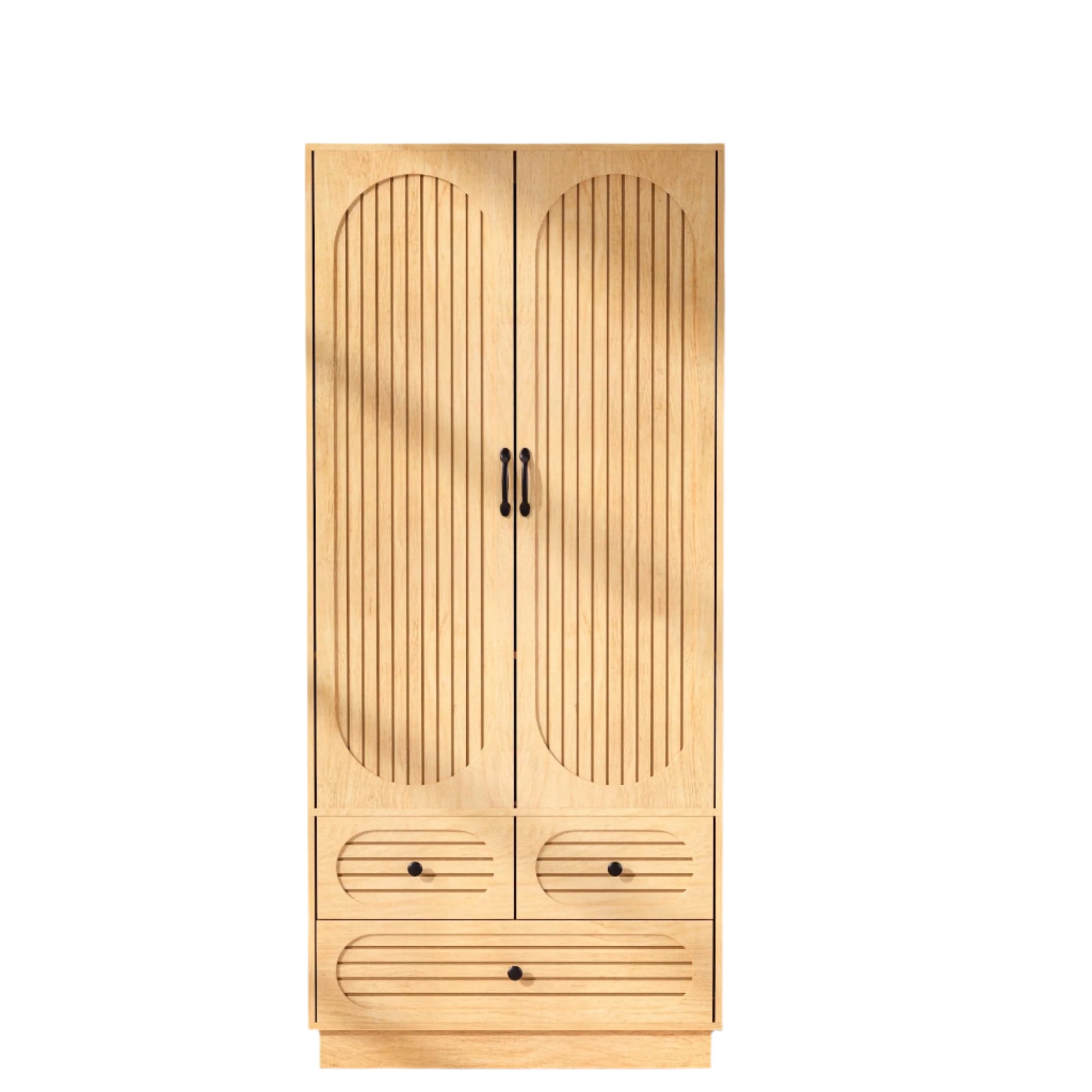 - Elegant Fluted Design: The unique fluted design on the doors of this wardrobe closet with doors adds sophistication and farmhouse charm. The wood grain finish and sophisticated black handles highlight simplicity and rusticity, enhancing visual appeal and complementing various interior styles, making it a versatile addition to your home.