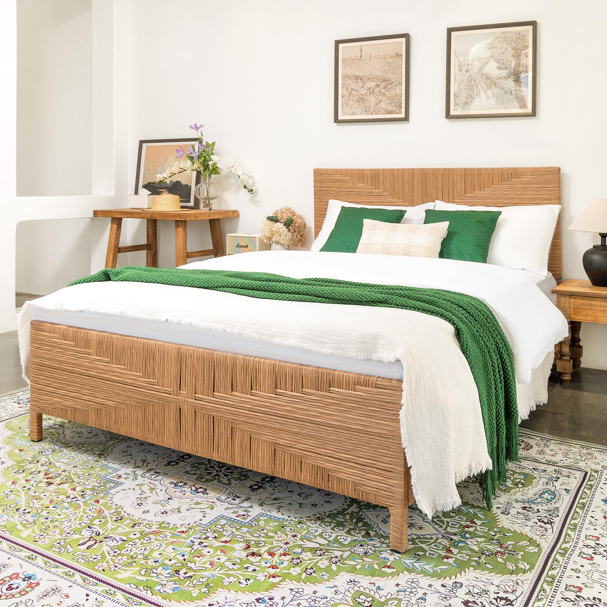 - Tall Headboard and Footboard – The mid-century modern-inspired tall rattan headboard offers excellent back support for reading, relaxing, or watching TV, while the elevated footboard maintains mattress position and enhances the sophisticated aesthetic of your sleeping space.