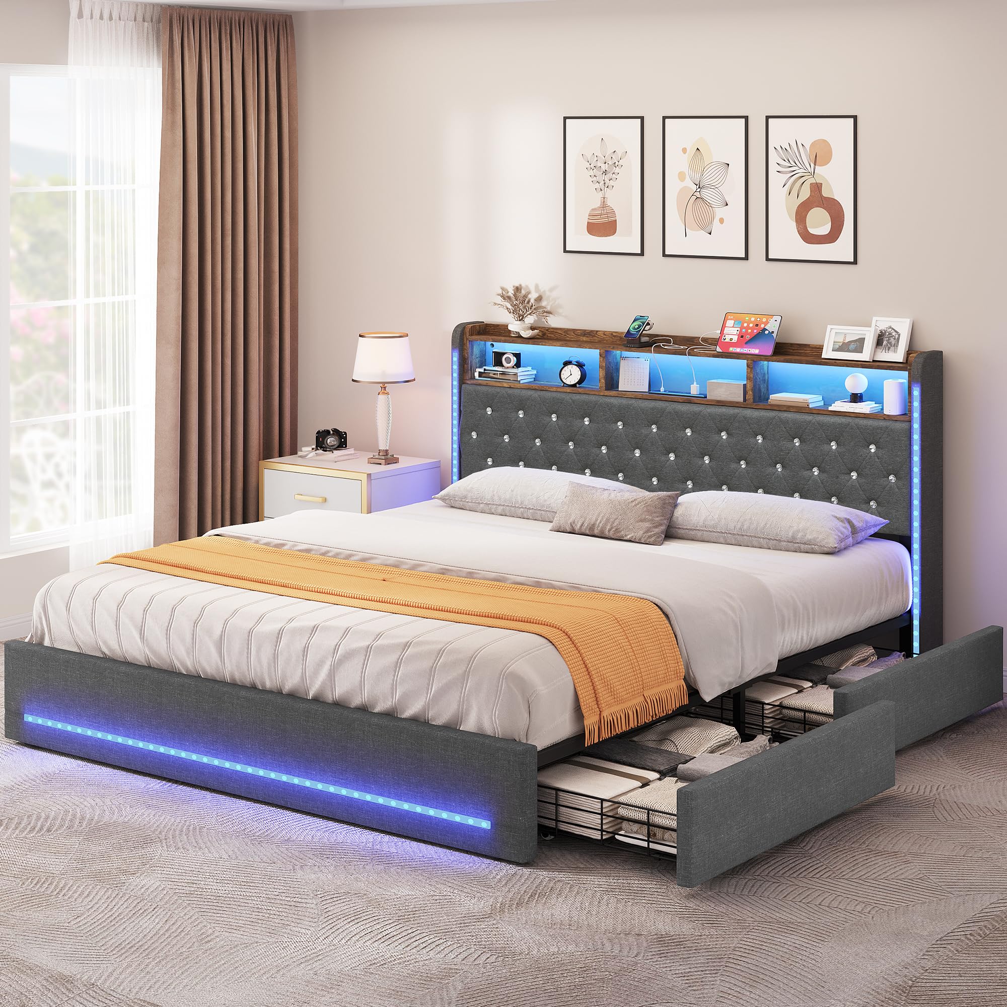 Queen Size Bed Frame with Storage Drawers, LED Bed Fram with Button Tufted