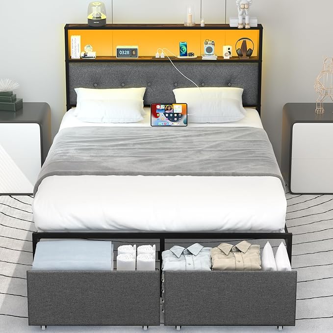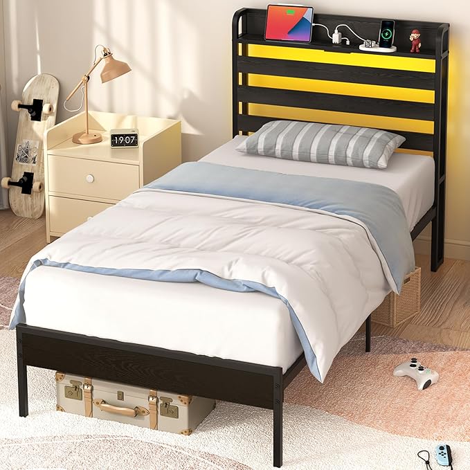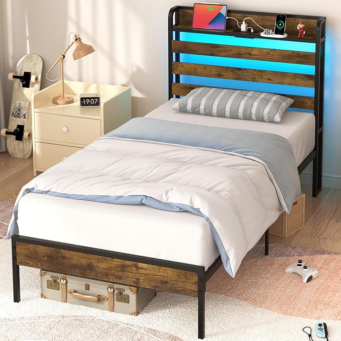 Twin Bed Frames with Storage Headboard, Led Bed Frame with Charging Station