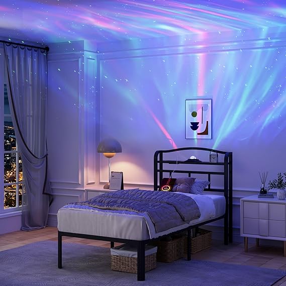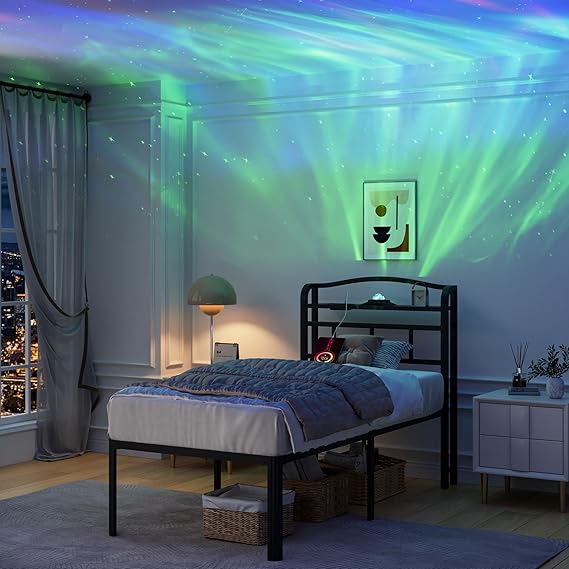 - 14 inch twin bed frame queen size metal includes aurora projector that can be controlled via a remote control. There are over 13 color effects, 3 different brightness levels, and 8 different white noise. Colors switch according to your mood, bringing you versatile bedroom styles.