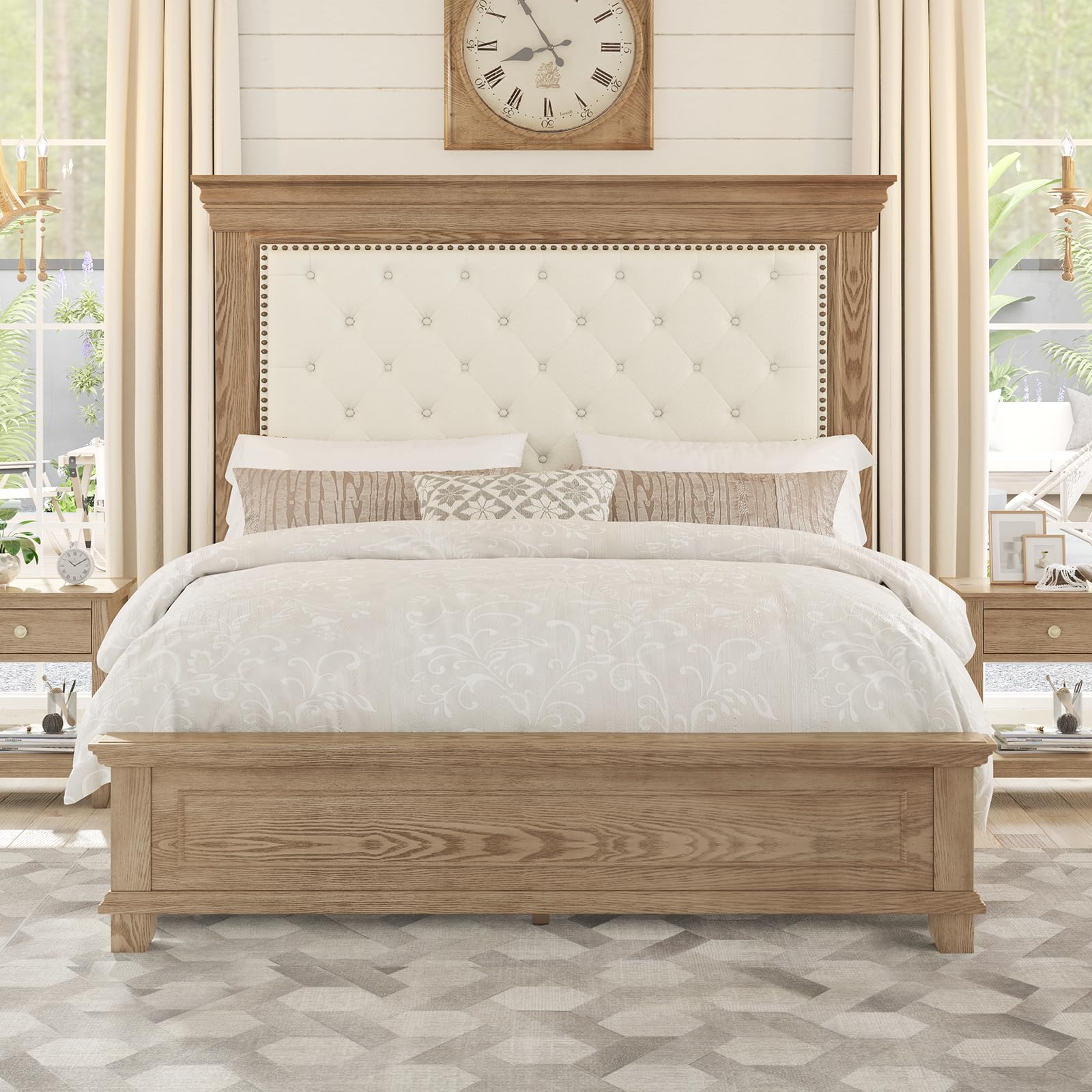 - [Exquisite Rustic Farmhouse Charm] Crafted with heavy crown molding railing & chenille fabric, a weathered antique wood grain finish perfect blend of classic & modern styles, button tufted & antique brass nail heads add an elegant touch to your room