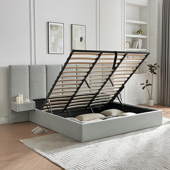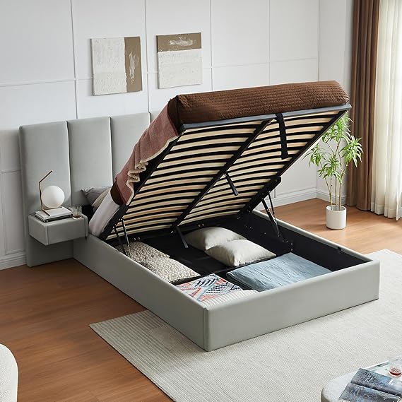 - SMOOTH HYDRAULIC LIFT SYSTEM: Equipped with a hydraulic lift bed mechanism, this lift up storage bed queen makes accessing under-bed storage easier than ever. Just pull the durable nylon ropes to raise the mattress and reveal ample space for suitcases, off-season clothes, and more. A reinforced metal stopper ensures safety and long-term reliability — no more struggling with heavy lifting