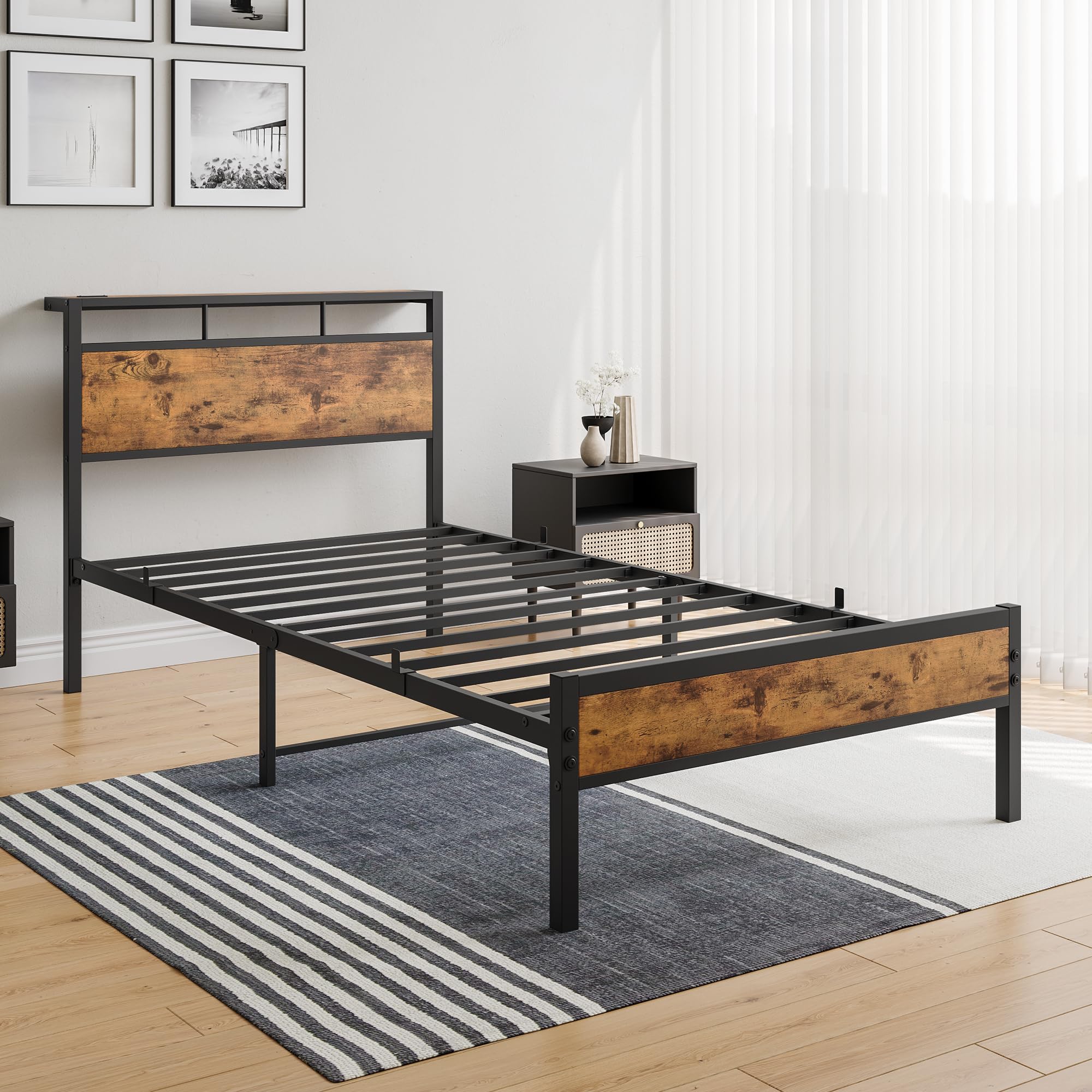 Twin Bed Frame with Headboard Storage,Single Wood Bed Frame